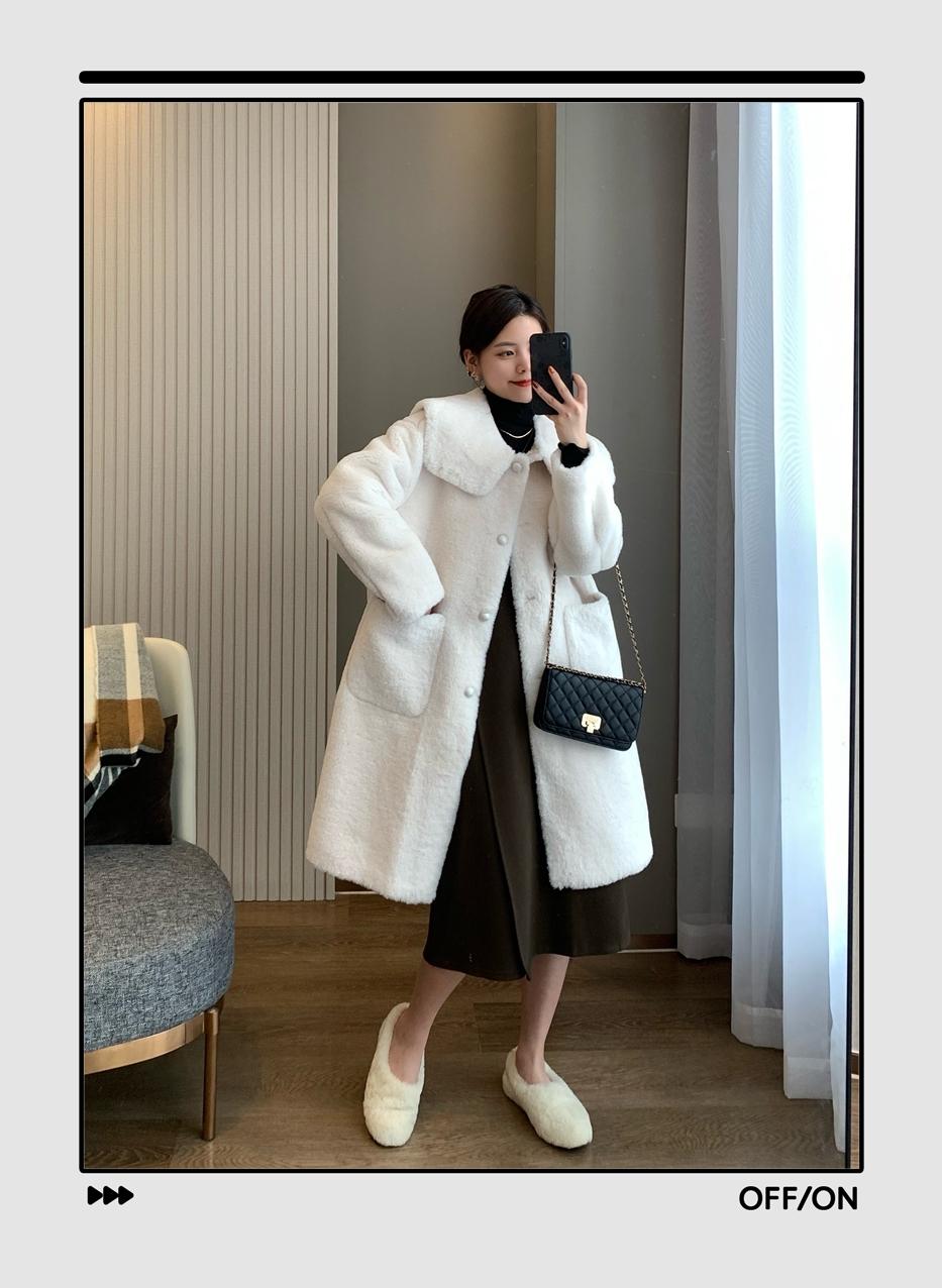 比如这件白色的毛毛外套,中长的版型,在里面内搭一件黑色高领毛衣,很好的拉长脖子线条。