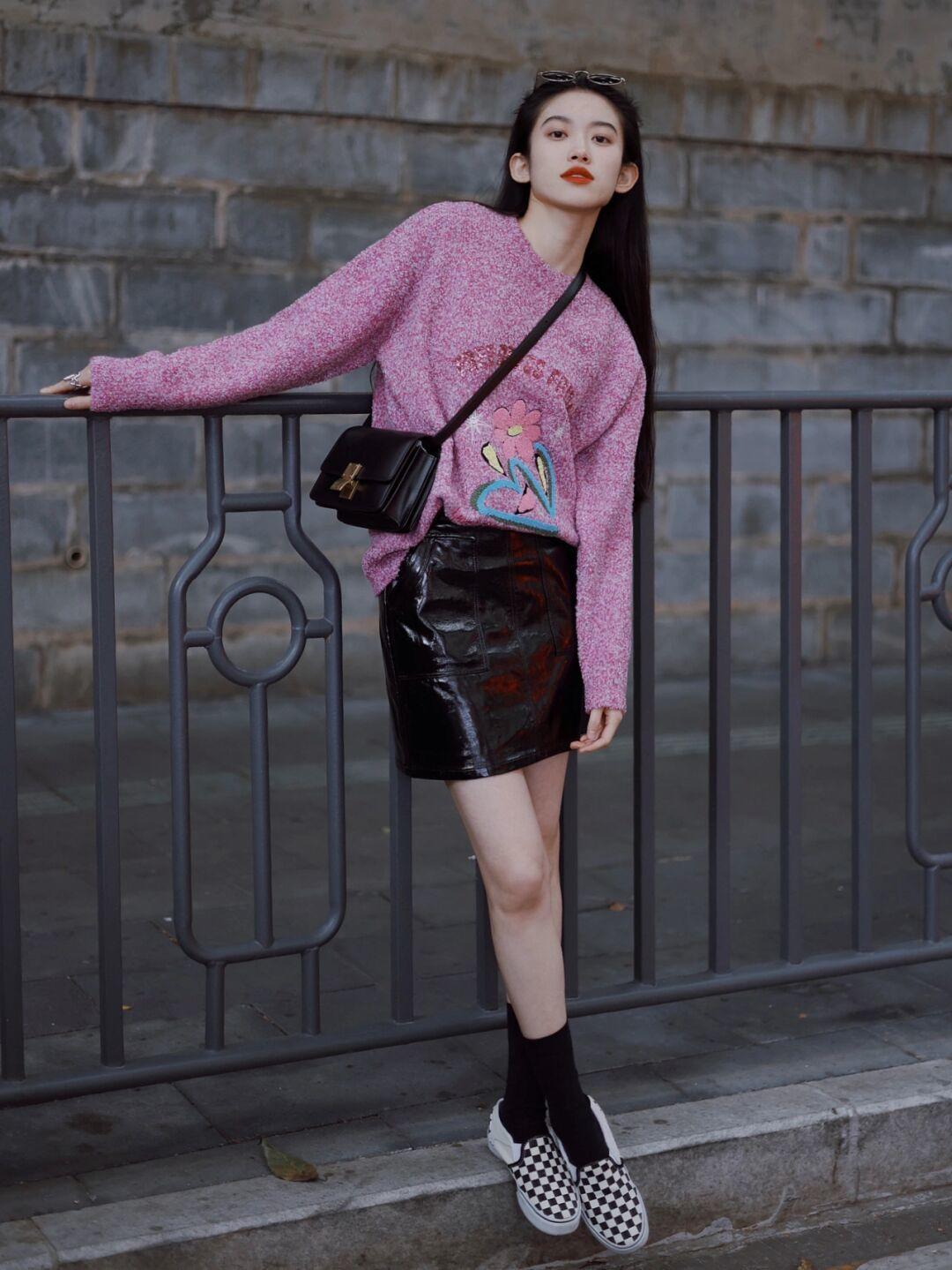 博主搭配了一条黑色皮质包臀裙,可以将毛衣的前方衣摆塞进腰身中,这样就能将小蛮腰展现在大家面前,皮质包臀裙很有女人味,会很好的修饰腰臀比,最适合梨型身材的美眉。