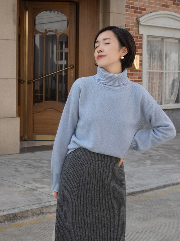 最后为大家推荐的是蓝色毛衣,这个颜色非常清新,虽然属于冷色调,但却不会让人觉得冷,因为它融入了几分白色,所以就可爱俏皮了许多,减龄感超强,与高领套头毛衣结合后还会很好的兼顾你的脖颈肌肤,起到保暖效果。