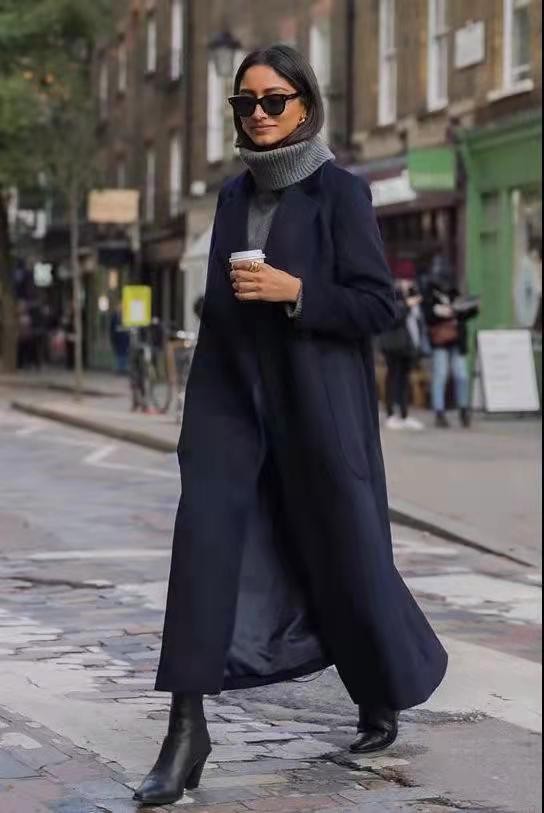 对于一些走高级成熟风格的女性来说,更偏爱黑灰风格的羊绒大衣,配上深色系的内搭,营造出高级的性冷淡风格。就拿这些长款样式的灰色羊绒大衣来说,配上黑色打底,整体看上去显瘦又稳重,搭配浅色系打底,则更偏向于休闲简约的风格。鞋子方面,也有多种选择,不管是配黑色短靴还是运动鞋,都是那么富有青春气息。