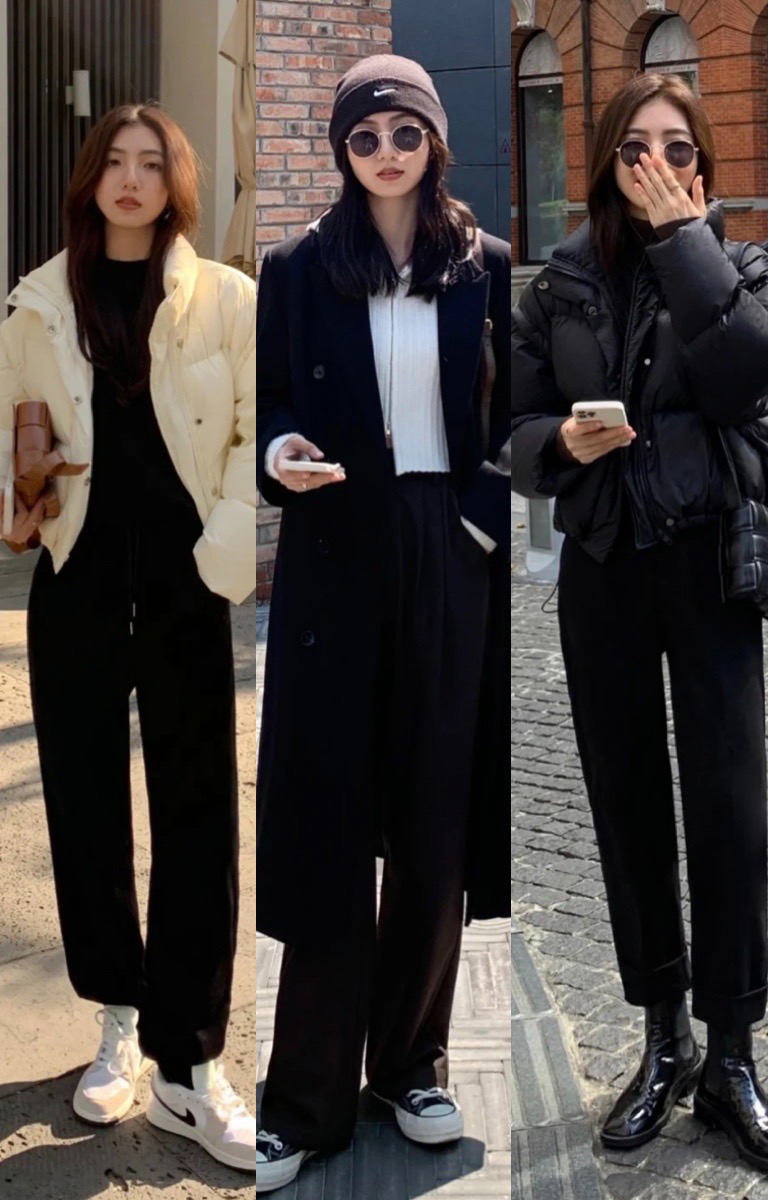 冬季常见的造型搭配有外套、内搭、裤子以及鞋子,裤子与其他任何一件单品同色都有显高的效果。当内搭和外套与裤子同色是对整体身材线条进行竖向修饰。