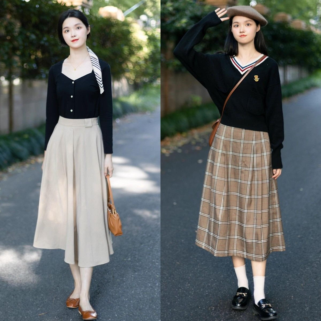 想穿出大气端庄的既视感一定要试试左图的搭配,将方领修身针织衫+过膝长裙搭配在一起优雅又知性,女人味十足,再加上一款丝带做头饰,女性的韵味感瞬间被展现得淋漓尽致。