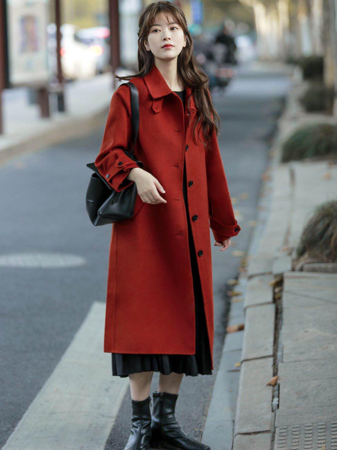 冬天红色大衣怎么搭配比较高级 黑色的半身裙+短靴 特别适合轻熟女!(4)
