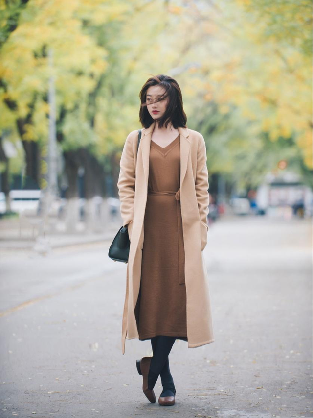 “大衣+针织连衣裙”的搭配更适合懒人姐妹,连衣裙的形式省去了选择内搭的时间。而且,这种搭配给人的感觉是慵懒随意又舒适优雅的,在搭配时,建议不要内外同长,会显得臃肿而且略显土气,内短外长的搭配方式可以显腿长,在搭配中显高。