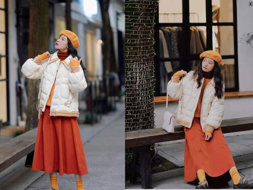 第一种穿法是“短款羽绒服+艳色系单品”。鲜艳亮丽的颜色就像是冬天里的一道暖光,既打破了冬天萧瑟氛围感,也让人心里觉得暖洋洋的,越看越好看。