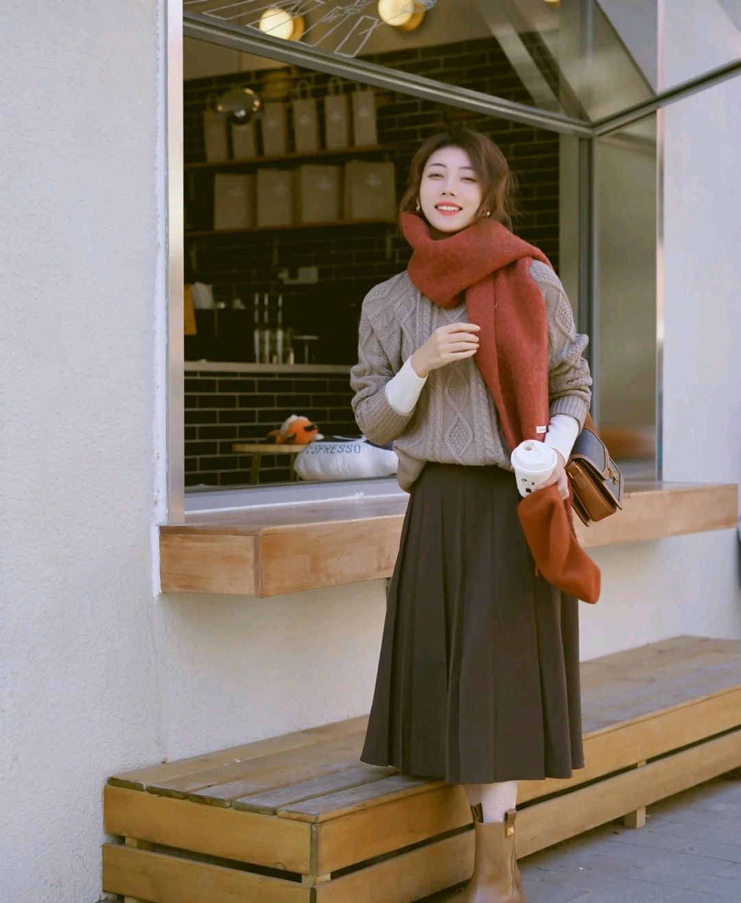 这位时尚博主选择了简简单单的灰色毛衣搭配咖啡色A字半身裙,穿出来的视觉效果很有女人味,虽然简简单单却很温柔。