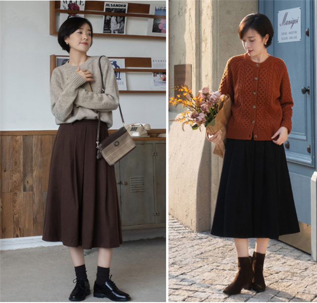 百褶半身裙适合搭配修身的上衣,这样可以形成松紧结合的效果,适合微胖的姐妹,也很适合梨形身材,遮住胯宽问题。