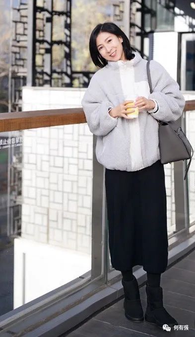 下半身结合黑色的打底裤以及黑色的雪地靴,用这种黑色系的穿搭延续了她的双腿,看上去比例特别修长,小个子美眉也可以多参考这样的穿搭。
