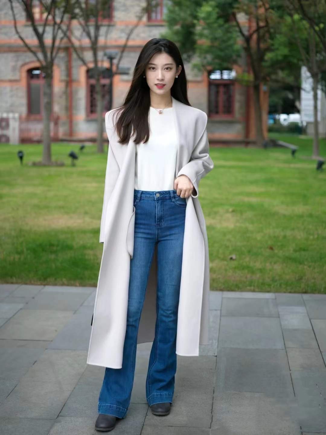 这时候直筒裤就成为一种更好的选择,如果双腿相对纤细一些,可以组合比较修身的直筒裤,显瘦的同时又让双腿呈现出挺拔之姿。搭一件垂坠的大衣,更显得优雅高级,稳重贵气。