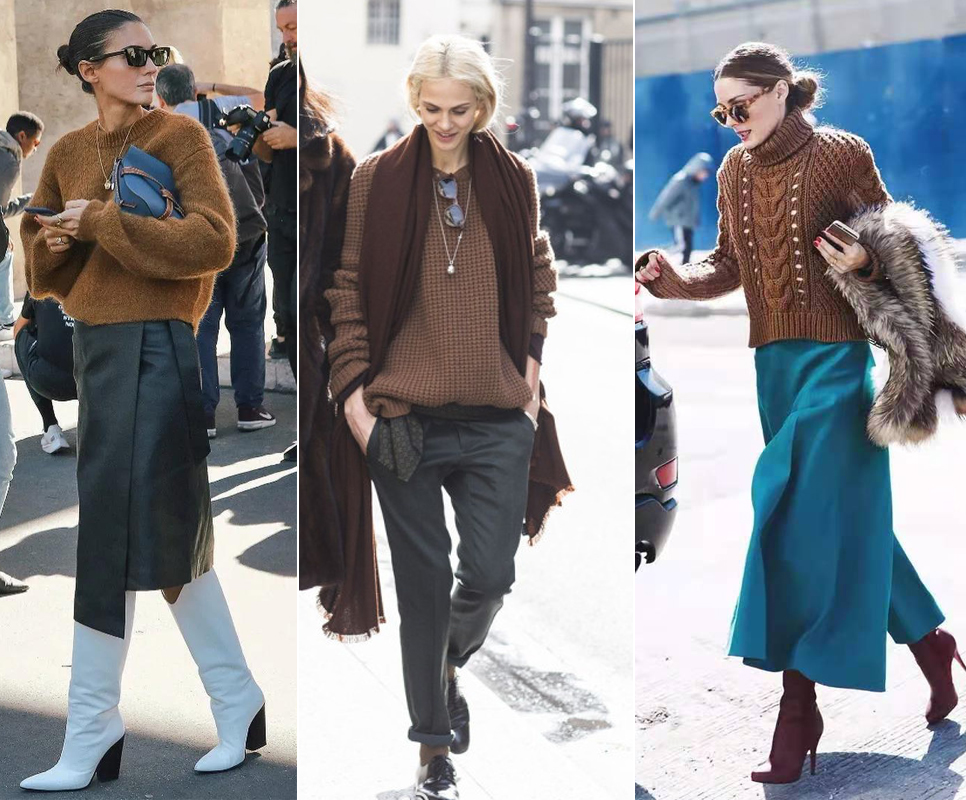 褐色单品最多见的就是各种毛衣,冬天穿非常合时宜。不过,棕褐色毛衣虽然质朴贵气,但如果个人的气质跟不上或者搭配不当,也很容易显得老气。值得参考的穿法是加入白色单品来提亮,或者搭配明亮的蓝色半裙来点缀,让整体穿搭的配色变得更独特。