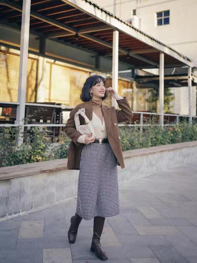 裙子和裙子之间的搭配既复古又时尚,尤其是带有格纹或者是印花的裙子,灯芯绒的搭配也非常的不错,适合整体造型的风格,有着秋冬浓烈的氛围,使造型变得既出众又有色彩的点缀,展现了成熟女性的精致与优雅。
