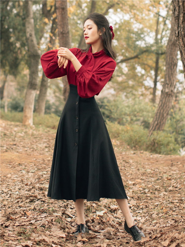 在选择半身裙的款式时,一定要注意的就是繁简的结合。如果半身裙是作为陪体衬托衬衫的设计感,那建议你选择精简些的款式,比如直筒裙、伞裙、百褶裙。