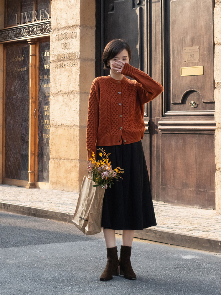 这款橘红色编织花纹的毛衣开衫,穿在个子娇小的女生身上,很是文艺耐看,还显得皮肤尤为白皙。下半身搭配同样面料的针织半裙,形成了简约又高级的搭配风格,很是经典耐看。