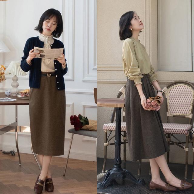 建议大家优先尝试直筒版型和A字版型的半身裙,风格随心简单,更有冬日氛围感。在搭配上也有着更多的可能性,无论是搭配衬衫还是毛衣、大衣都很时髦有范。