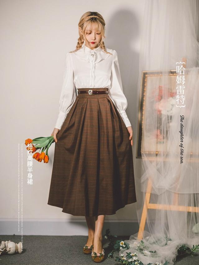 荷叶领的白色衬衫展露出极具典雅感的淑女气质,减龄且纯洁,在此基础上搭配一款深棕色格纹半身裙,立马将复古感与典雅感凸显出来,展现出极具复古效果的配色,建议在法式穿搭时多多利用棕色+白色打造出复古的效果。