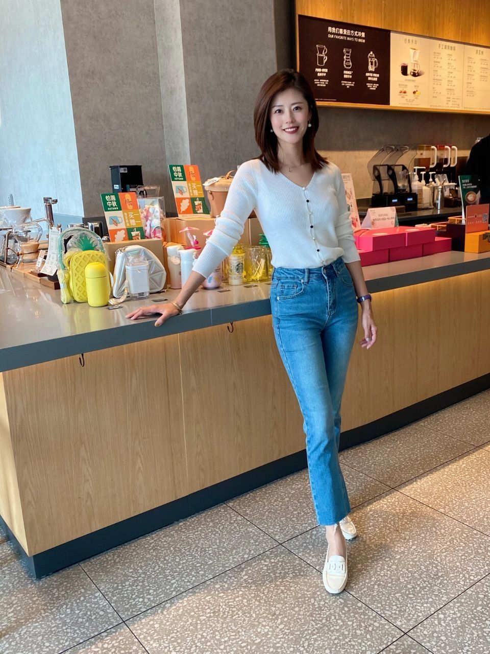 而白色针织衫与长裤的组合则更偏干练一些,细节上选择较为修身的针织衫和牛仔裤,刚好将个人玲珑有型的身材曲线展现出来,让人更加性感有型,将成熟女性魅力完美展现出来。