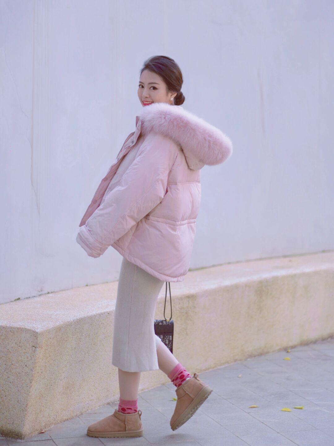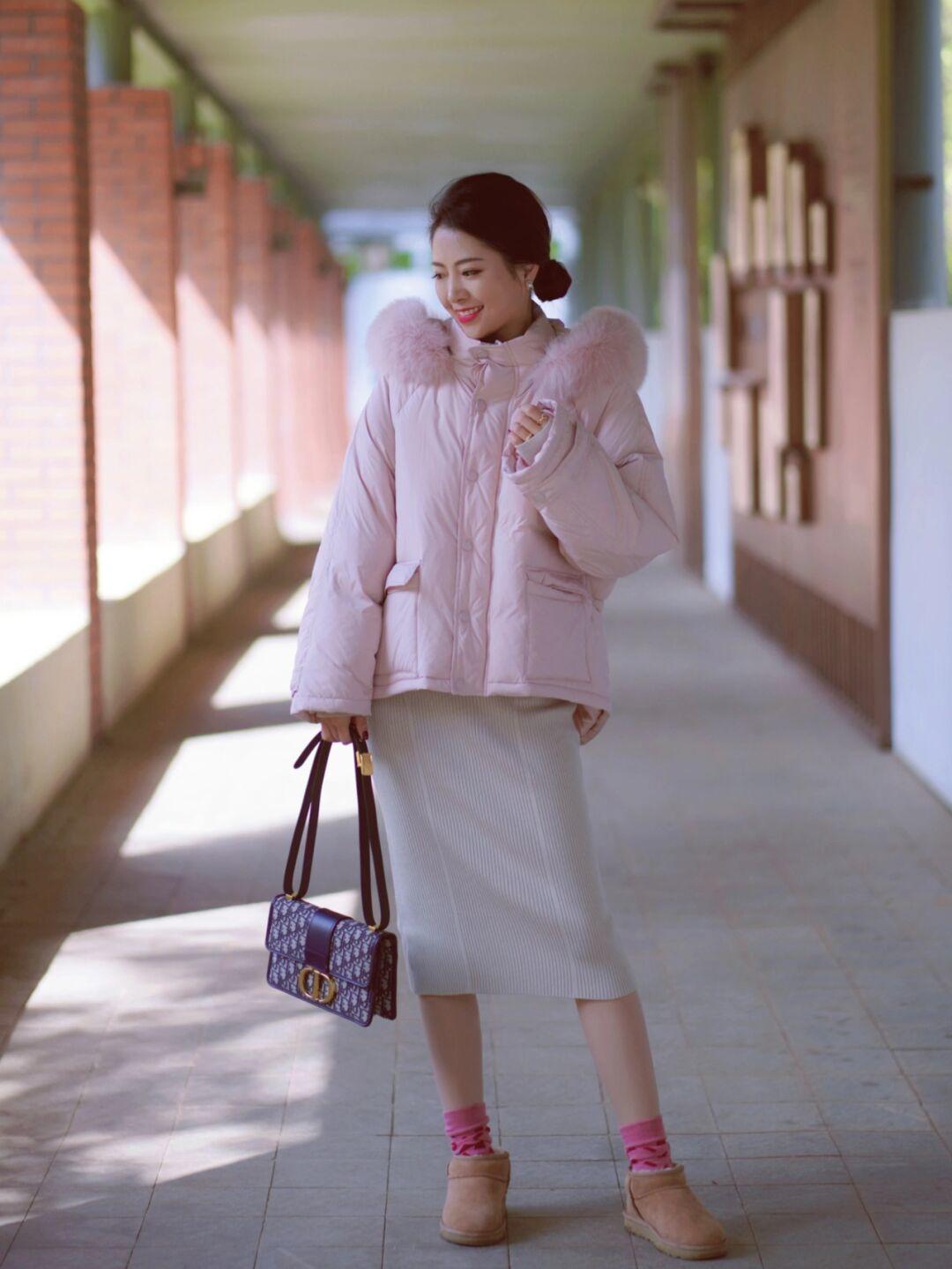 这位博主很聪明的在粉色羽绒服下面搭配了一条白色直筒半身裙,让整套造型的女人味更强一些。谁说冬天就不能穿裙子了?其实冬天只要在裙子里面搭配上厚实的连裤袜或者是光腿神器就完全没有问题,并且这样的造型真的可以赚足回头率。