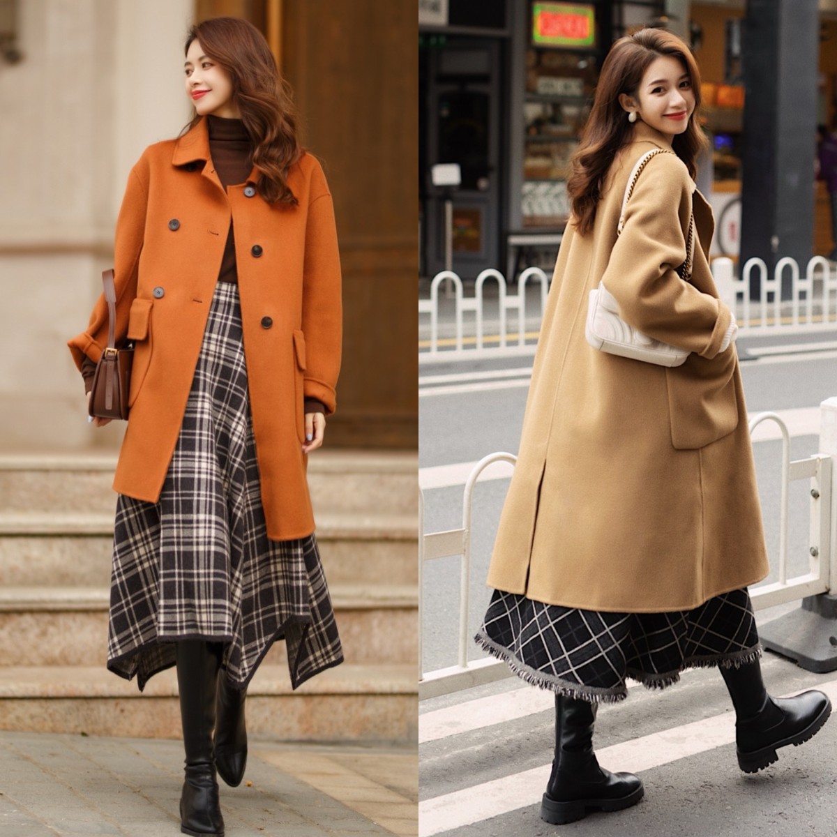 在具体搭配时,我们就可根据裙装的款式着重挑选了。如果喜欢回头率高一些的穿法,那不妨试试用大衣和格纹裙搭配格纹裙,属于文艺又复古的类型,搭配纯色系大衣打造出“一繁一简”的反差,不仅能丰富搭配的色彩感降低撞衫率,还能加强气质感。