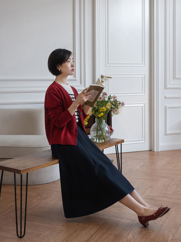 外套结合红色的针织衫,这种叠穿搭配也很保暖,适合怕冷的美眉,红色的针织衫和下半身的红色高跟鞋也呼应起来了,看起来很温柔知性,时髦大气,颜色之间还可以呼应起来。