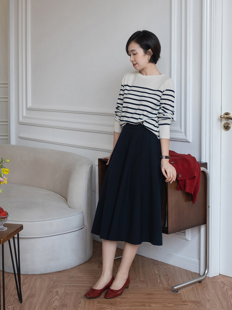 黑白色的条纹衫也很经典,不管是颜色还是整体的纹路都非常高级,再加上博主下半身搭配了经典的小黑裙,呈现的风格还是比较优雅的,值得借鉴。同时尝试的半身裙还是宽松的版型,更适合梨形身材的美眉,即便你的比例没那么出挑都可以尝试。