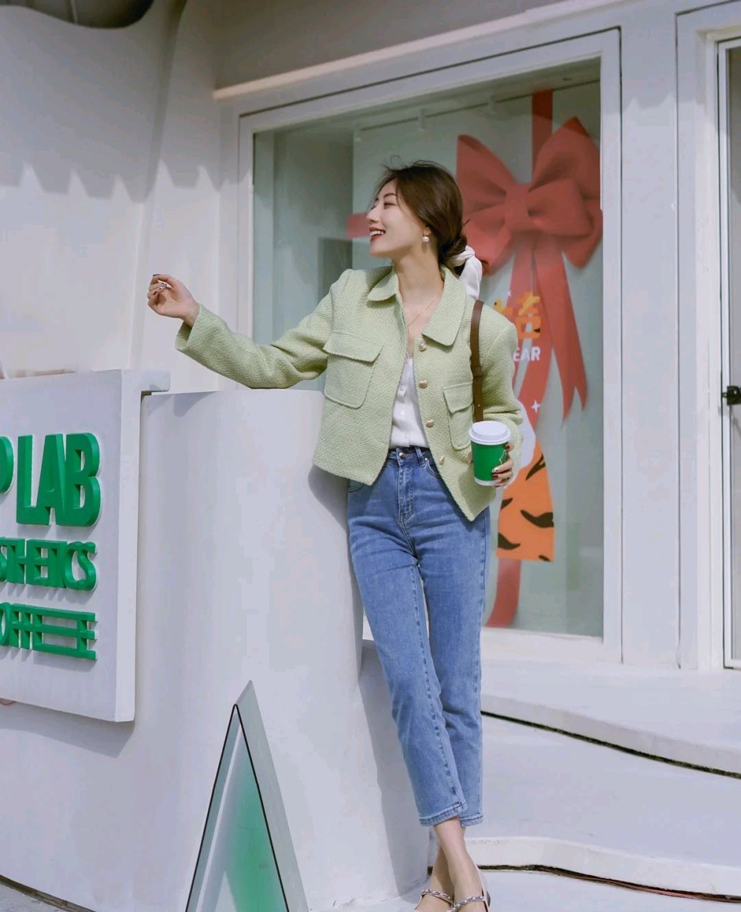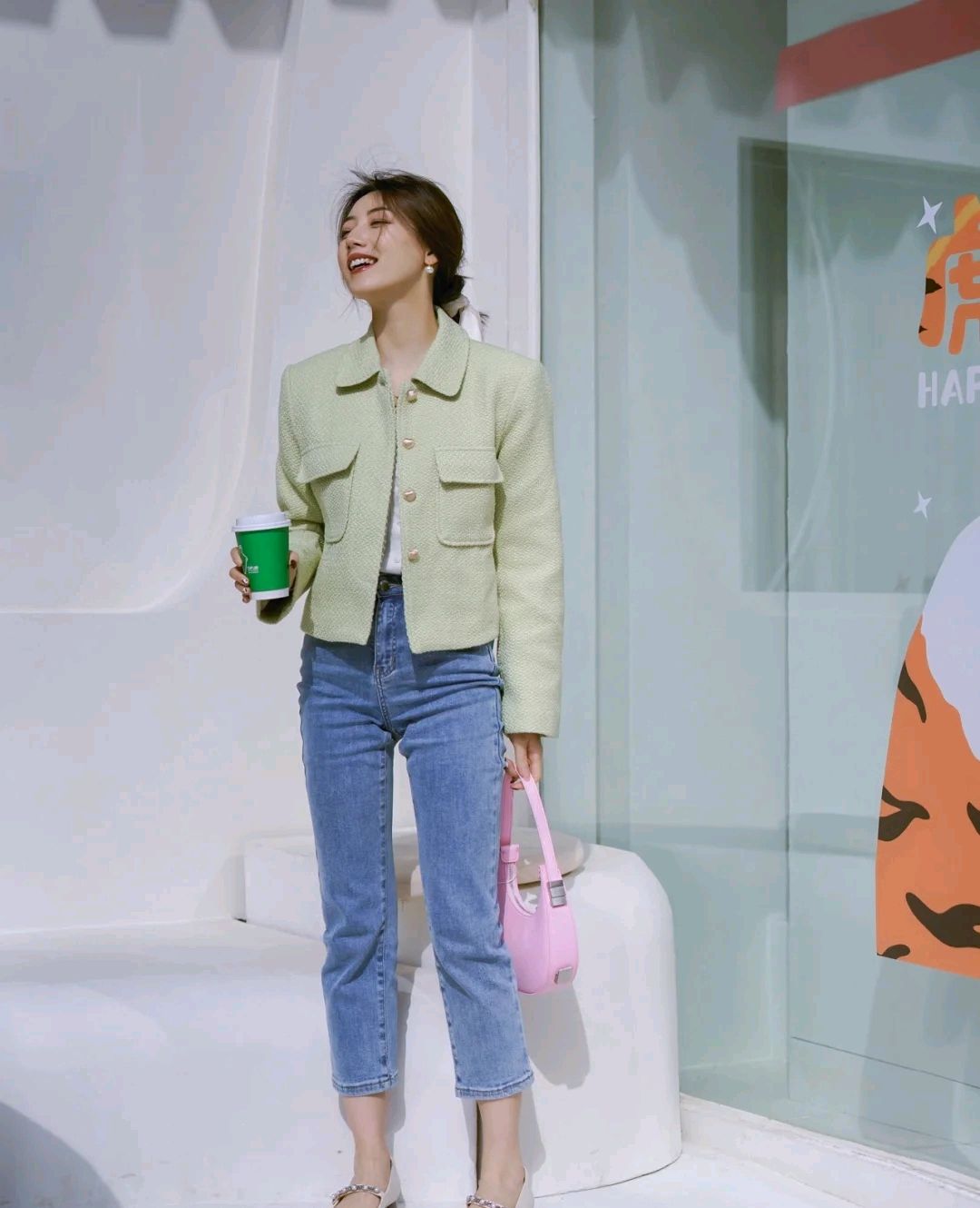 2022年春天怎么穿好看 浅黄色小香风外套搭配蓝色牛仔裤 显白又减龄(7)