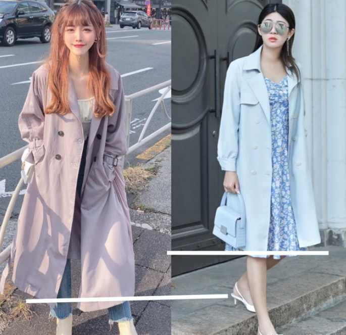 一般来说,到小腿处的风衣的款式会很显得很长,会把整个人都罩起来,不仅显的宽大也没什么美感。而到膝盖处的风衣,则能够很好地罩住内搭的长度,露出纤细的长腿,也能让我们在视觉上更加显高。