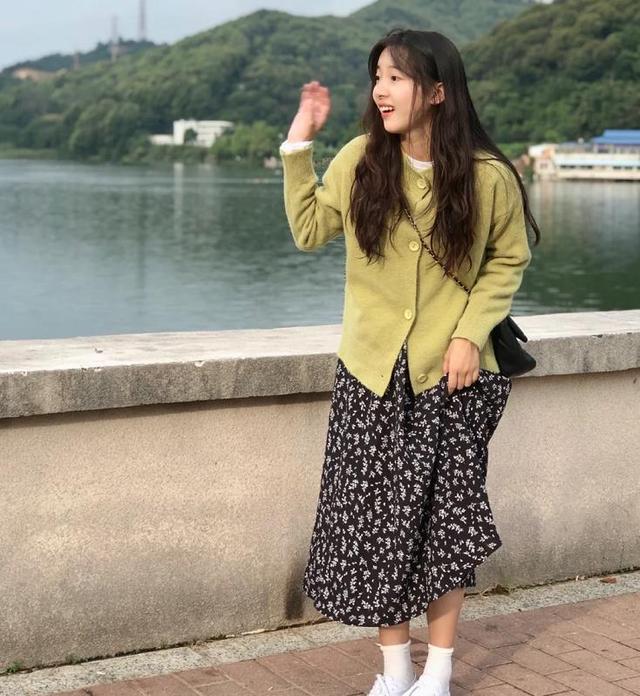 下装这一次选了条黑底碎花半身长裙,与绿色开衫组合在一起,也太显温柔气质了吧?脚下踩着一双白色运动鞋就好,挺好看的。