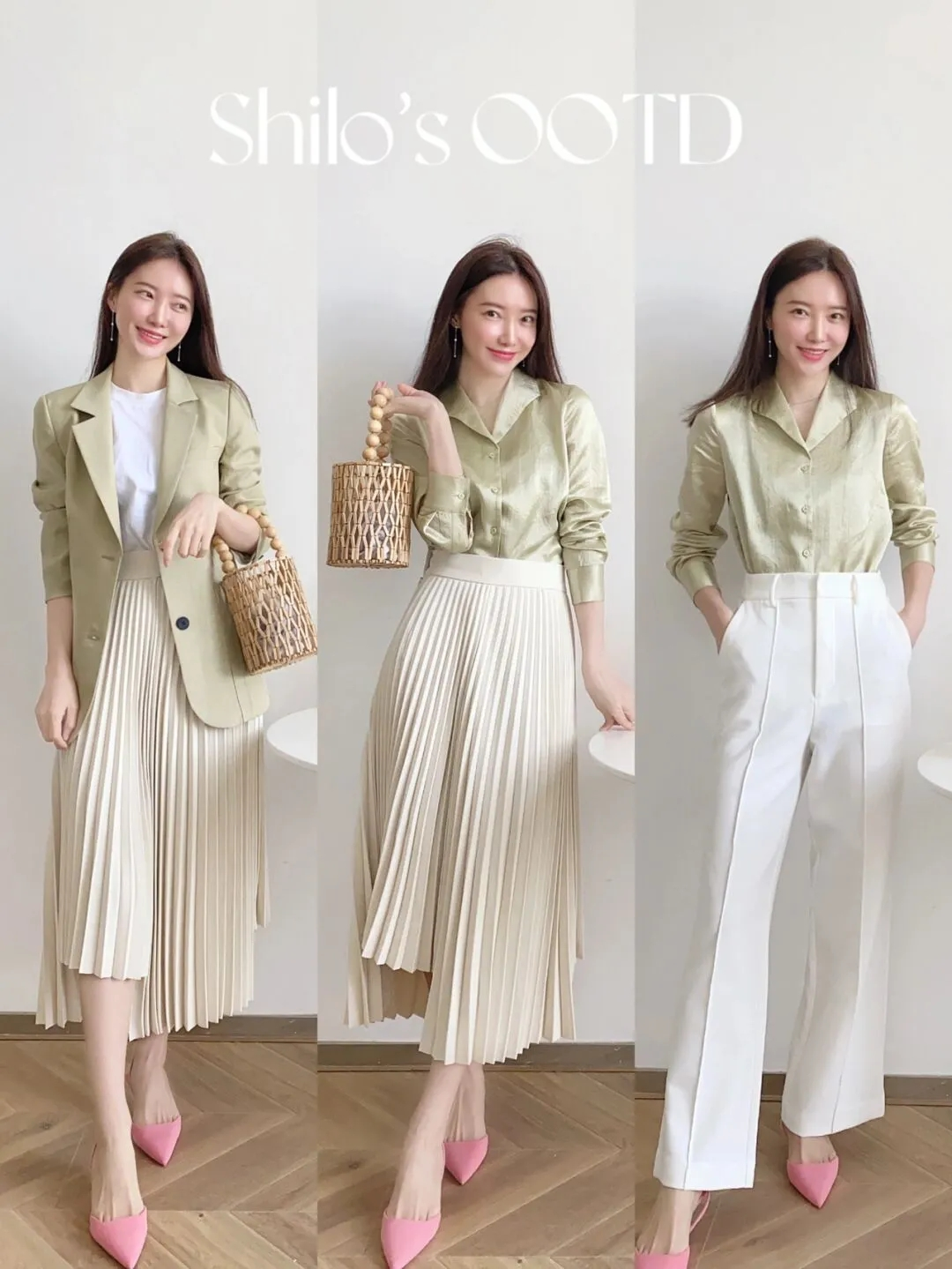 春天职场怎么穿搭显气质?绿色上衣+白色半身裙+粉色鞋子 时尚又减龄(2)