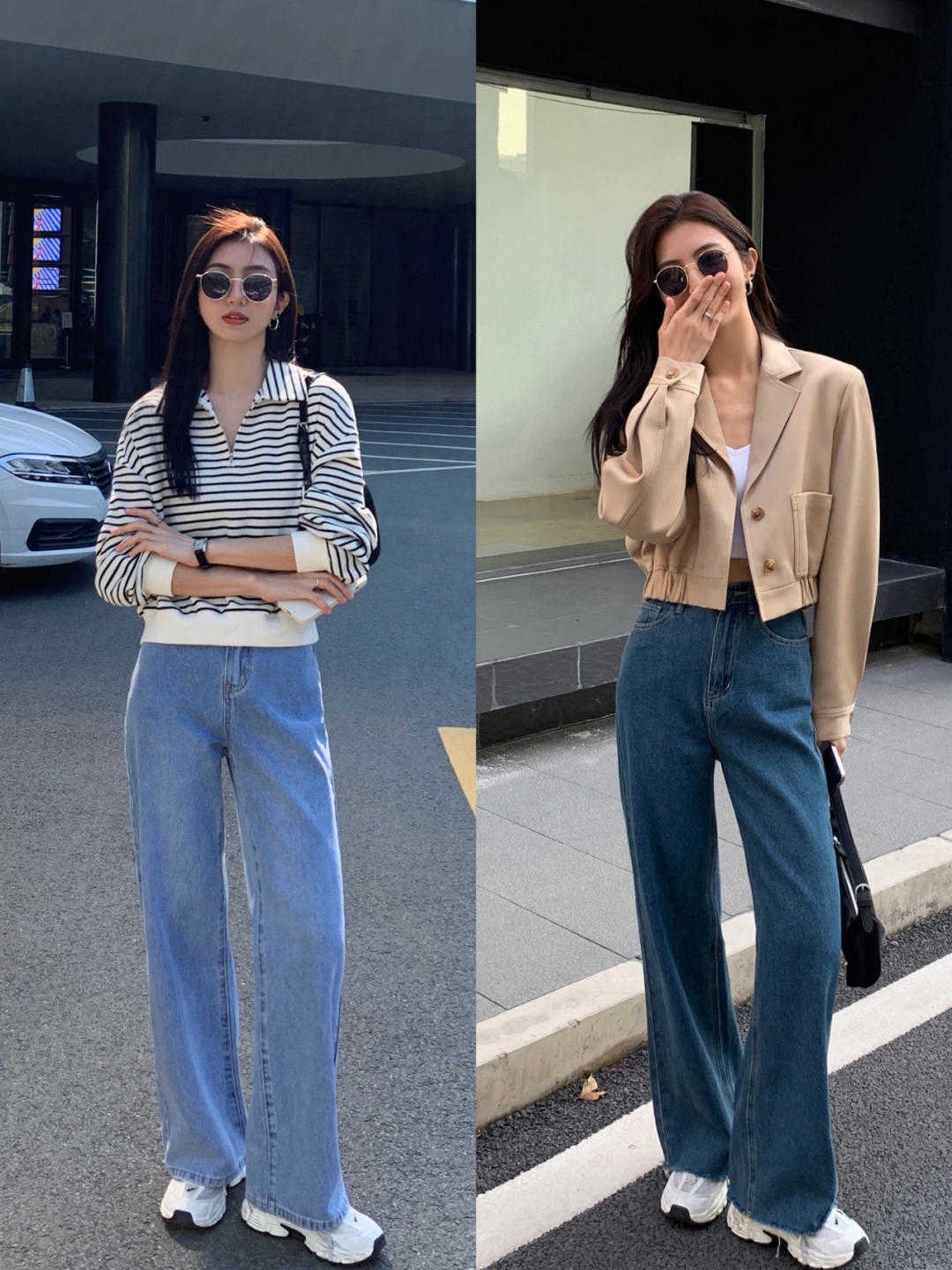 穿裤装的话,推荐你可以多尝试用阔腿裤凹造型,毕竟这对于腿型的要求不是很高,腿粗的美眉也能驾驭,牛仔阔腿裤简约休闲,搭配针织衫或者是西装单品都不错,像下面的博主用短款外套搭配上高腰牛仔裤就会显得腿很长。