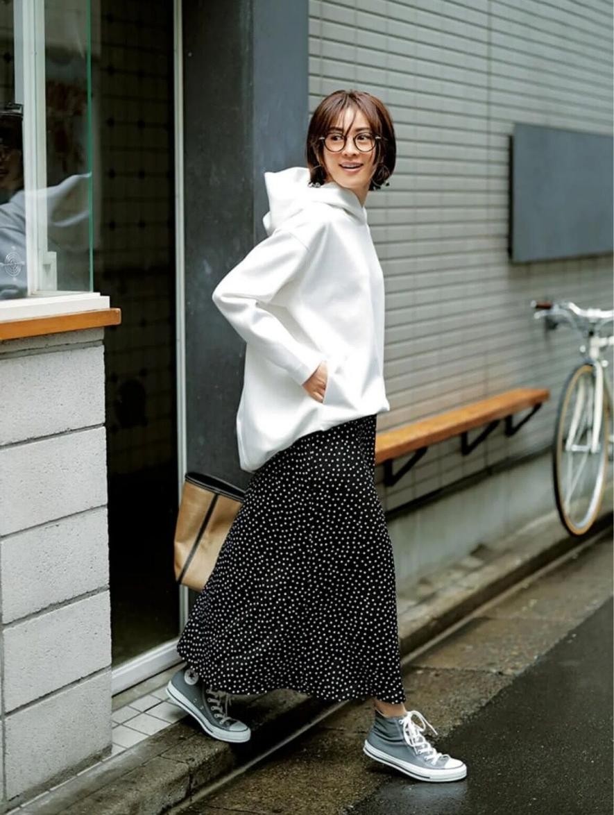 除了廓形的西装,纯色的运动型卫衣也是很好的选择,都是无性别单品,但是卫衣的运动属性明显要更强烈一些。白色宽松卫衣+黑色波点印花裙,运动洒脱又不失小清新,如此调和两种风格让人惊呼高级,日常出门绝对吸睛又耀眼。