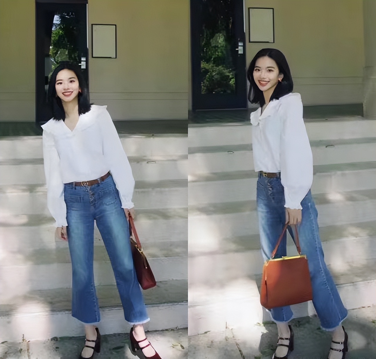 白色衬衫也可以搭配蓝色牛仔裤,一样好看又减龄,白衬衫是娃娃领的设计,整个人都展现出了青春活力的状态,果然白色的衬衫就是百搭又好看,精致又气质。