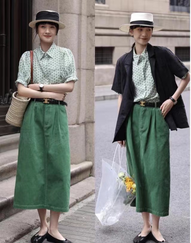 模特这一套浅绿色波点衬衫与军绿色半身裙的搭配,一条装饰的皮带,帽子,手表,使人看起来有着一种帅气又不失温柔的感觉,如果单品穿起来觉得单调,搭配一件黑色小外套也一样好看。