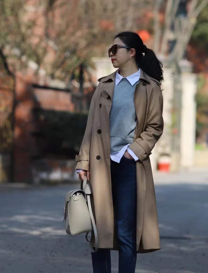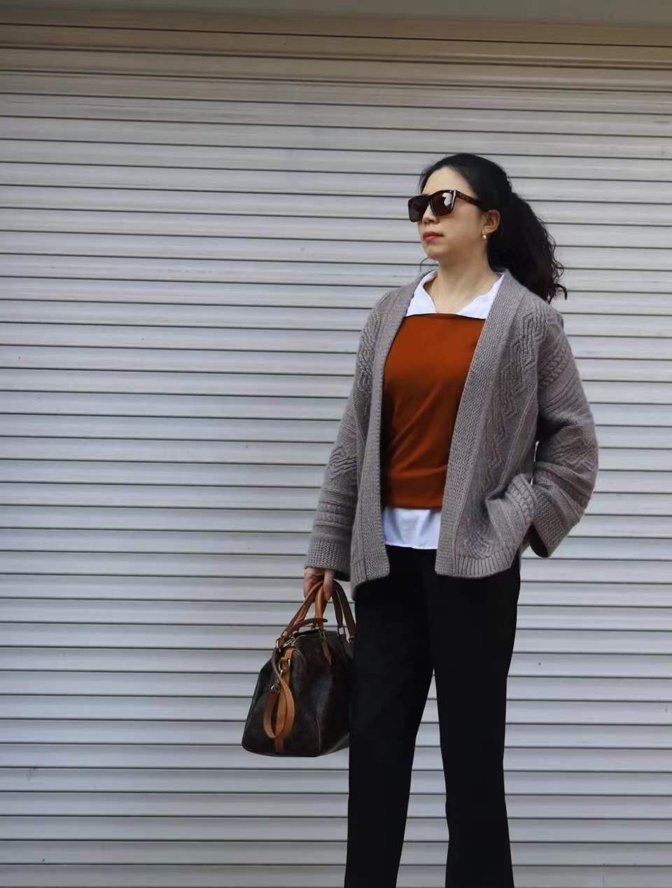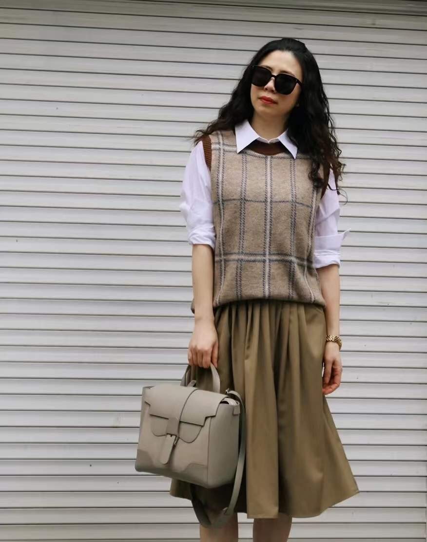 将衬衫与背心组合在一起,简直就是减龄神器,想必没有中年女性会拒绝这样学院风满满的造型,一秒将人带回学生时代,经典的格纹毛衣采用了卡其色这样简约的色彩,与裙子在颜色上不谋而合,虽然裙子上有百褶元素,但却不像百褶裙那样俏皮,反而多了几分温婉的力量,就连手提包都是采用了学院风,书包款式减龄又不会显得过于稚嫩。