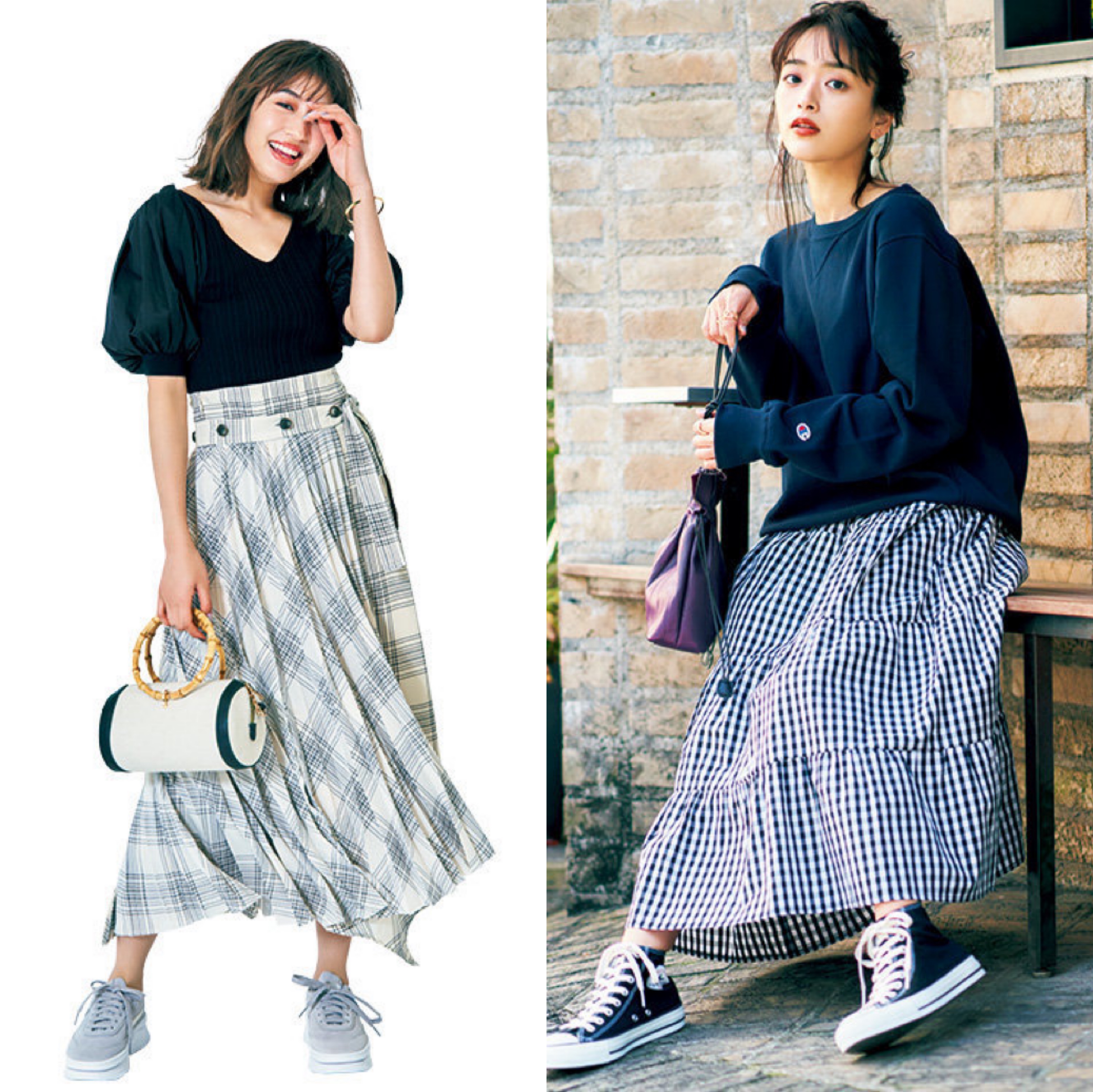 浅灰色的运动鞋很容易搭配有图案的裙子,格纹裙和运动鞋以浅色系在一起,上衣用深色针织优雅收紧,格子裙 + 熟悉的灰色运动鞋,打造休闲造型;收紧双脚的黑色运动鞋与看起来很幼稚的方格分层裙子很相配,与卫衣相得益彰的张力,适度休闲的感觉很不错!