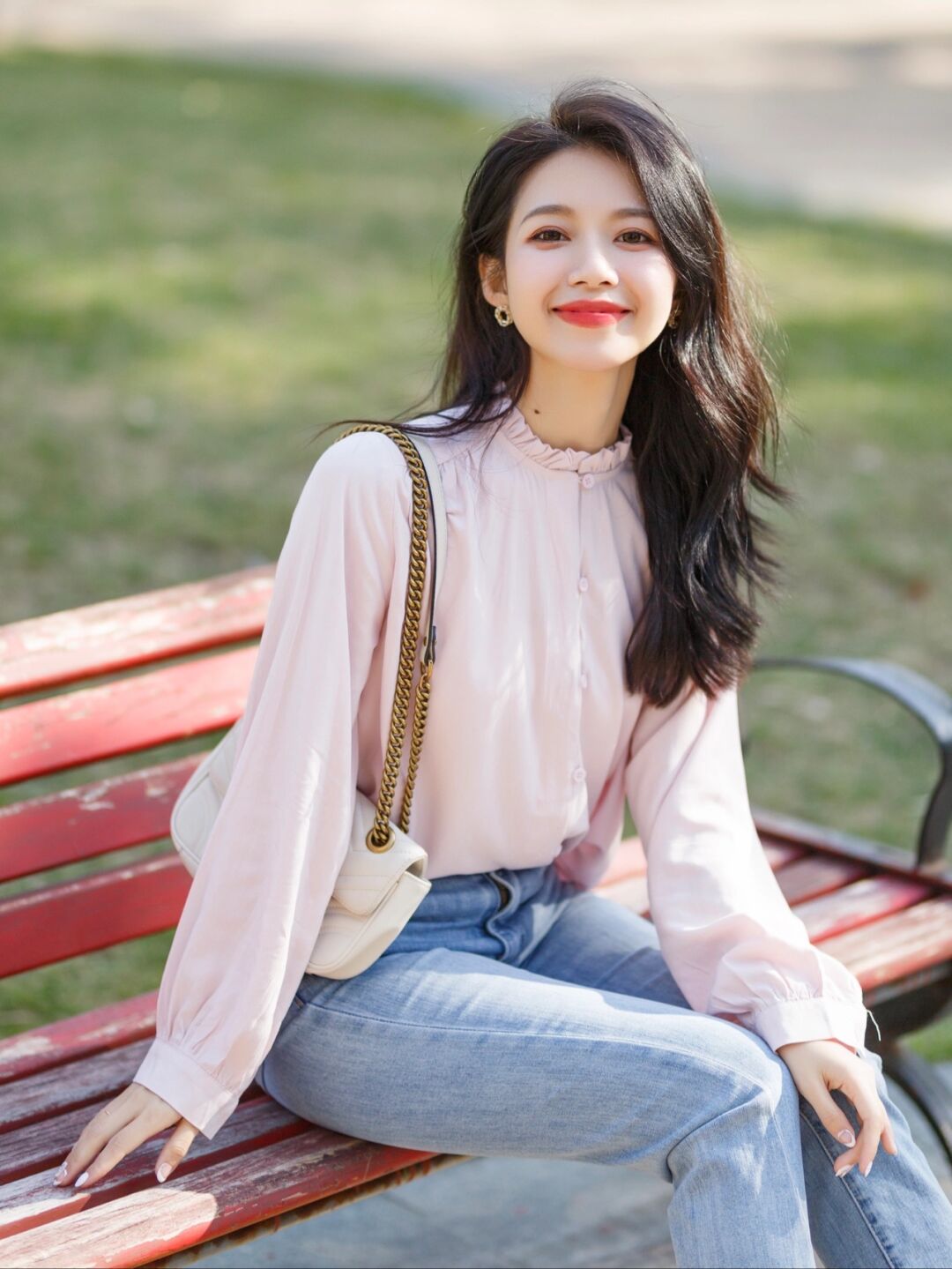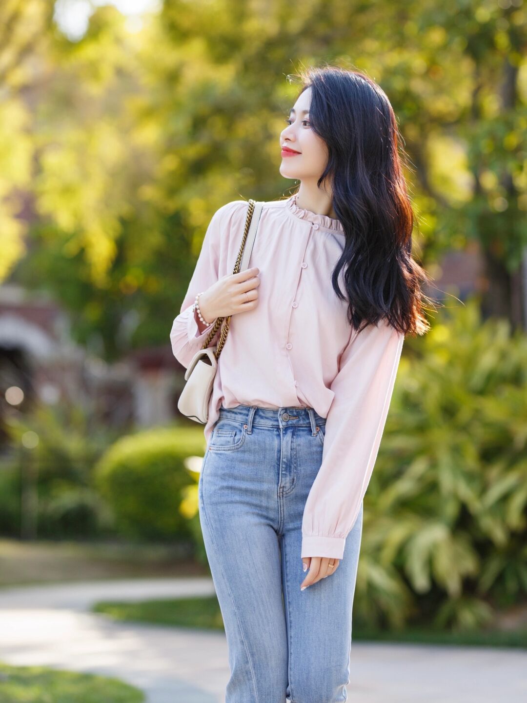你可以用九分牛仔裤和这一件樱花粉衬衫结合,加上踩着一双尖头的高跟鞋,整个造型精致又漂亮,小姐姐带着微微的笑容,美如初恋女友一般,真的太迷人了点。