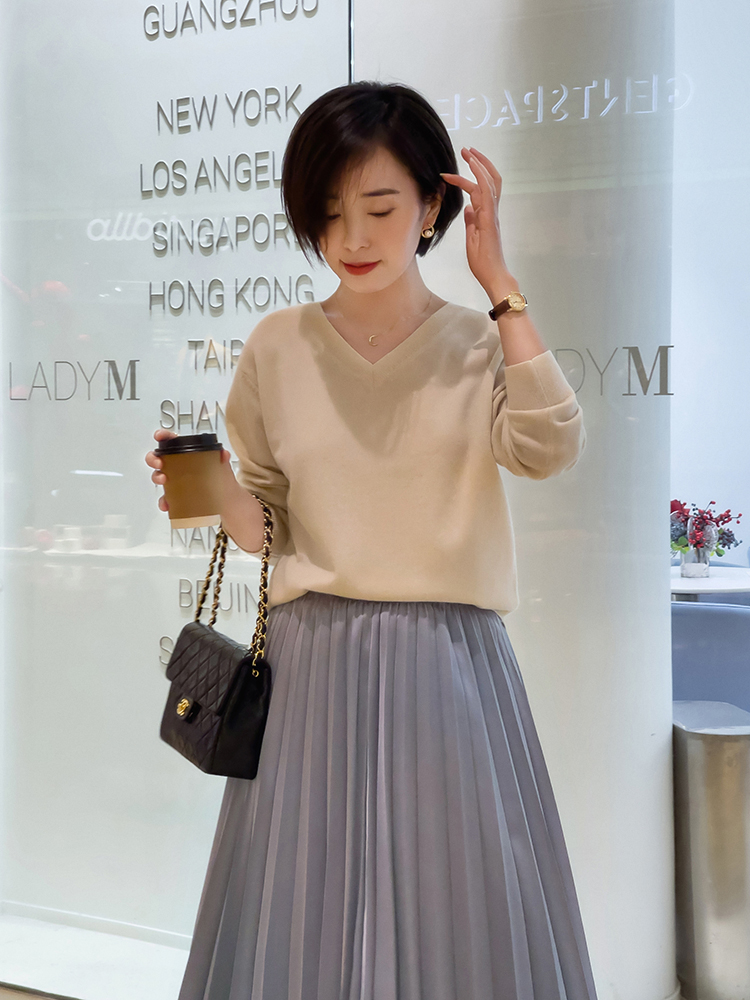 学博主用米色针织衫搭配上蓝色的百褶半身裙,展现出温柔气质,看上去也很浪漫,丝毫不会觉得沉闷,塞衣角的方式也体现出了腰身,小个子必备哦。