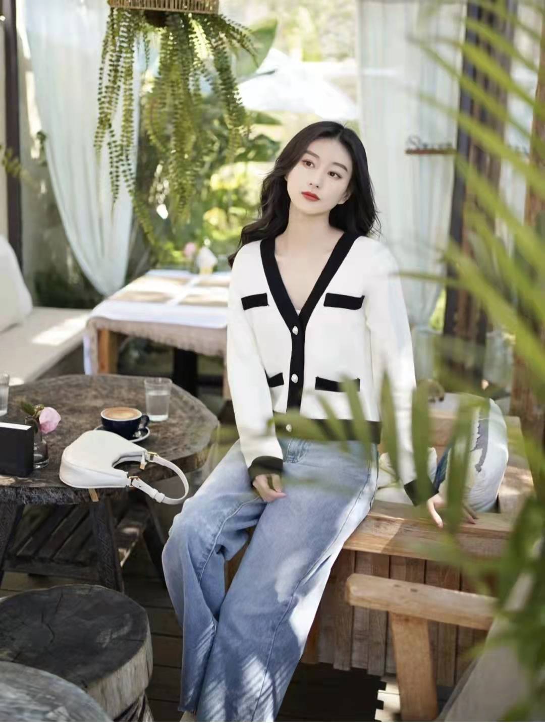 look2 黑白小香风针织衫+复古蓝直筒牛仔裤