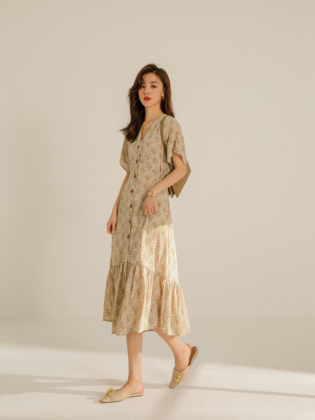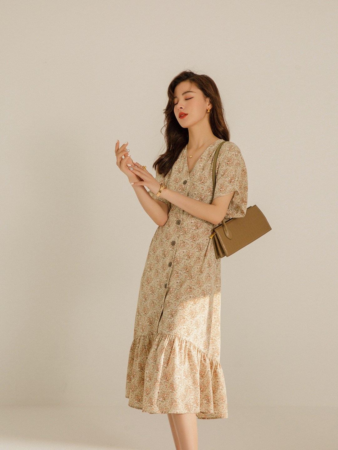 这一件连衣裙的垂感非常好,属于雪纺碎花连衣裙,上身效果非常地不错,透气性很好,加上是短袖的设计,穿起来也不会闷热。