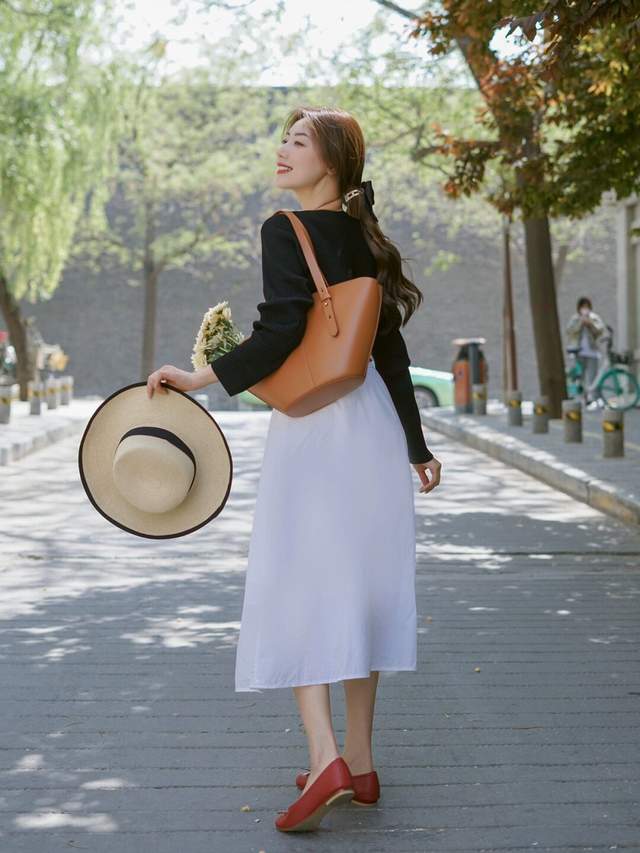 加上踩着一双红色的平底单鞋,“红色+白色+黑色”,这3个颜色结合起来都是经典色的搭配,真的绝了。