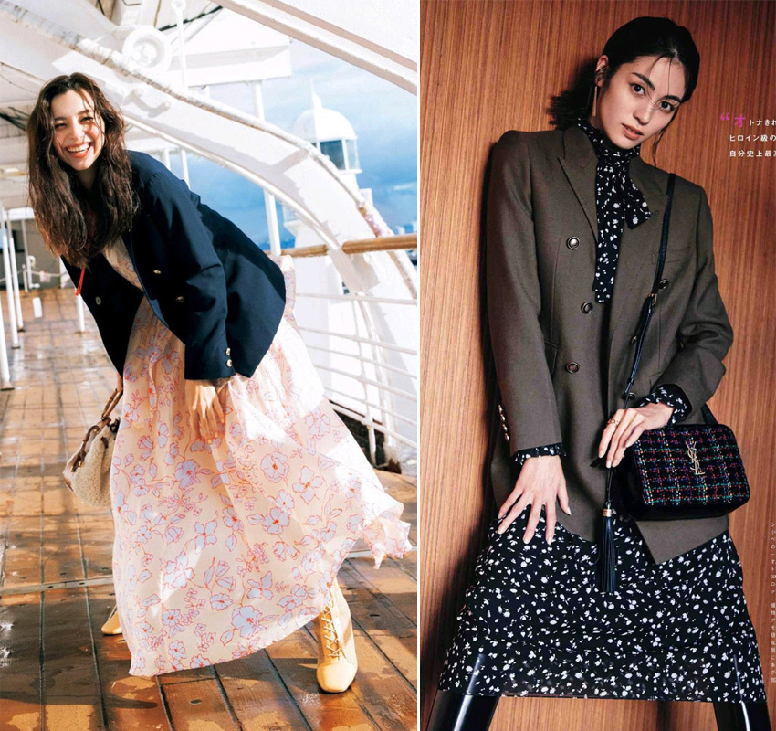 浅粉色印花连衣裙,搭配藏蓝色小西装,甜美又帅气,整体造型更显温柔优雅。而黑色碎花连衣裙,搭配深灰色西装外套,有几分俏皮可爱但又不失沉稳大气,展现迷人风采。