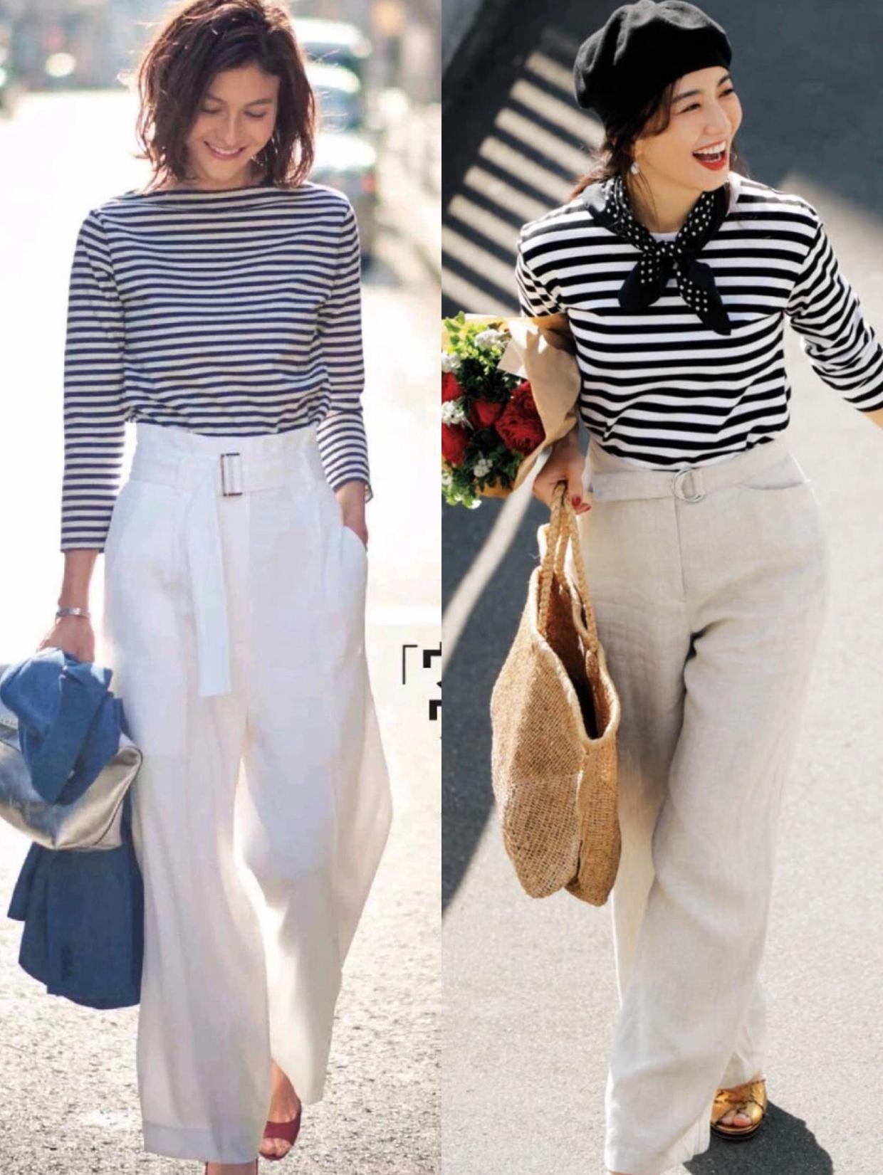 白色则代表着清新与大气,特别有女人味,也可以与其他颜色结合,起到点亮暗沉的作用,在下面的两款造型中,博主选择了黑白横条纹上衣+白色阔腿裤的搭配方式,白色阔腿裤与上衣中的白色形成了色彩上的呼应,整体看来和谐自然,黑白横条纹印花的融入也丰富了整体的层次感,还能展现出显瘦的效果。