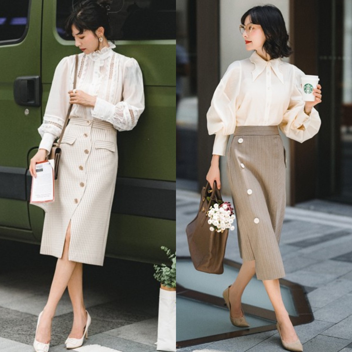 在这里需要提醒大家一点,如果你有这小肚腩的困扰,就可以选择像下图右边博主一样,选择一款“腰封较宽”的半身裙,或者直接搭配一条宽腰封,用于收敛腰线,还更显法式女人味。