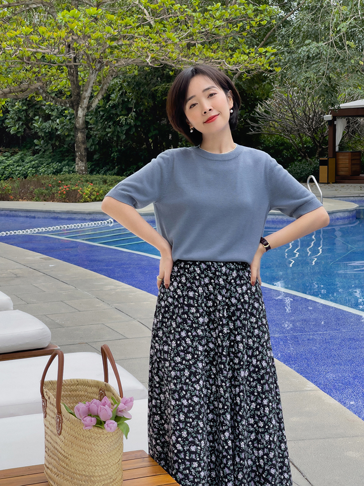 用一条春夏法式高腰碎花半身裙,和灰蓝色的短袖针织衫,显得 复古通勤,就算这样搭配去上班,也很适合,雪纺a字裙的版型,很修饰身材,腿型粗的女孩子选择它就可以。