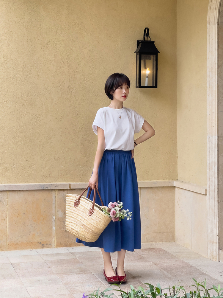 想要百搭直接选择白色T恤不会出错,和什么颜色的半身裙都能结合得起来,就像这一身穿搭造型,用一条宝蓝色的百褶裙来结合,看起来很清爽大气,而且很有女人味,很适合40岁左右的女性。