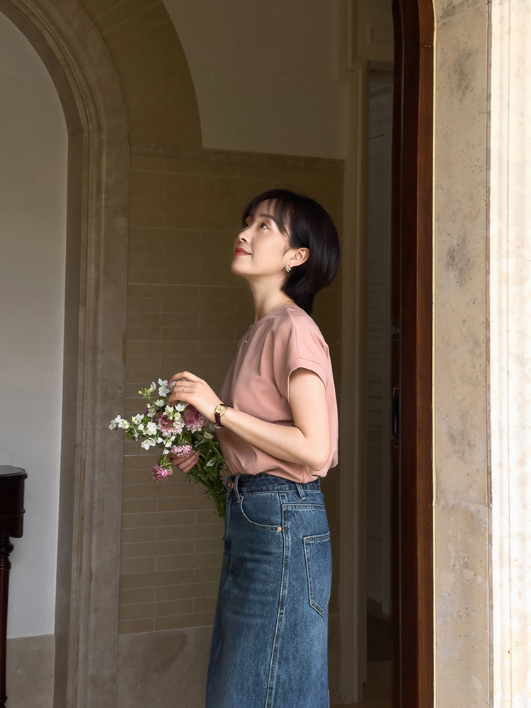牛仔面料单品天生就拥有时尚元素,不管是半身裙也好,还是裤子,上身之后洋气又高级,夏款复古高腰设计的水洗牛仔裙,把枯粉色的T恤塞进半身裙里头,可以提升腰线,勒出蚂蚁腰,显高显瘦的效果就出来了。▼