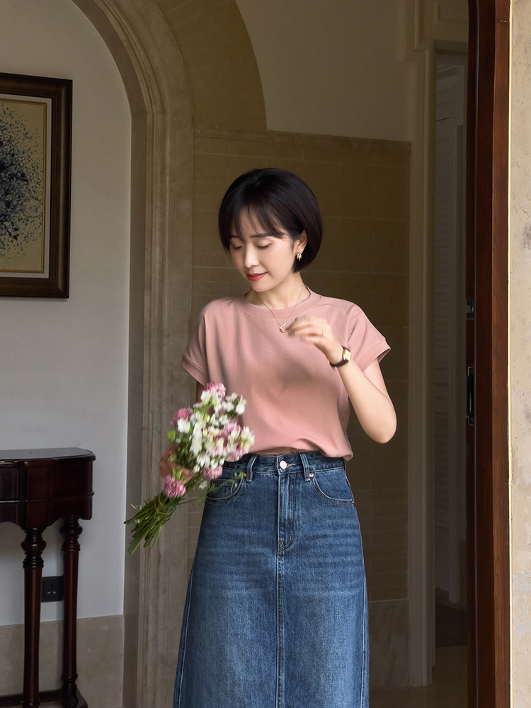 这枯粉色T恤很修饰肤色,让你显白又显嫩,哪一个女孩子不喜欢粉色的衣服单品呢!它和白色T恤的款式一样,只是不同的颜色,所以选择牛仔裤半身裙来结合,这样看起来更加清新减龄。