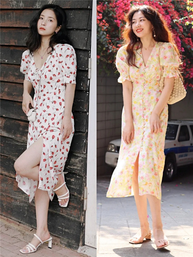 就像博主用这些开叉碎花裙凹造型,侧面的开叉设计修饰了大腿肌肤,能够延伸双腿曲线,增高显瘦效果更好一些。