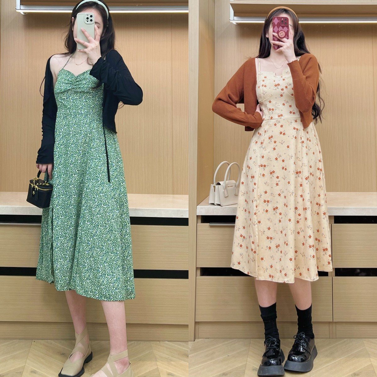 像这位博主穿的这件A字版型的田园复古碎花裙,外扩的裙摆,包容性极强,再加上颜色繁杂的碎花元素,视觉显瘦up!