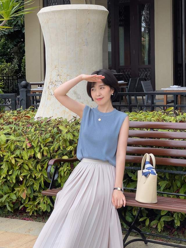 可以借鉴一下这位时尚博主的穿搭风格,她选择了雾霾蓝针织衫搭配杏色半身裙,穿出来的视觉效果简简单单却很温柔,也很有气质,突出了女性特有的温柔魅力。