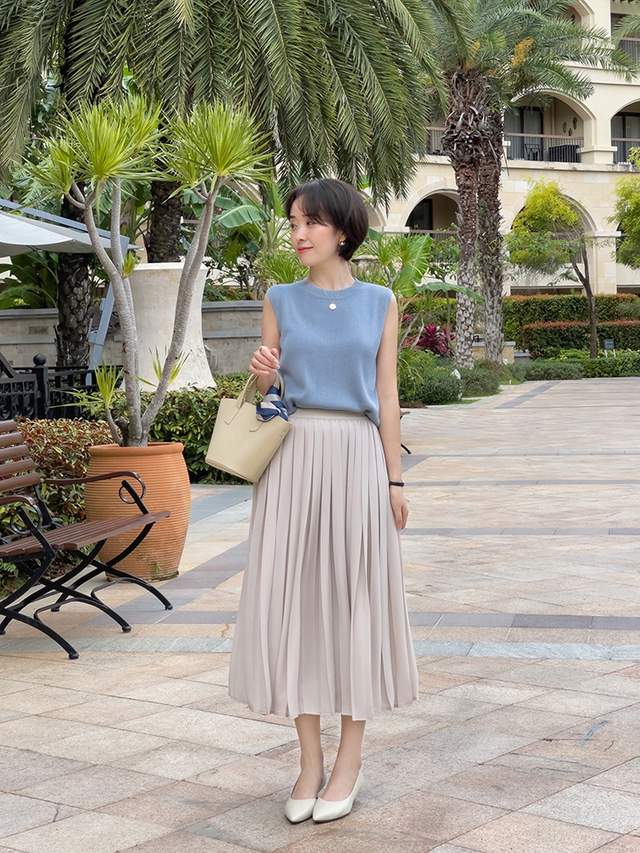 百褶裙也是很不错的时尚单品,对大部分女生来讲都很友好,因为大部分百褶裙都是略显宽松的设计,包容性比较强,尤其是微胖的女生或者是腿型不够完美的女生都可以轻松驾驭。